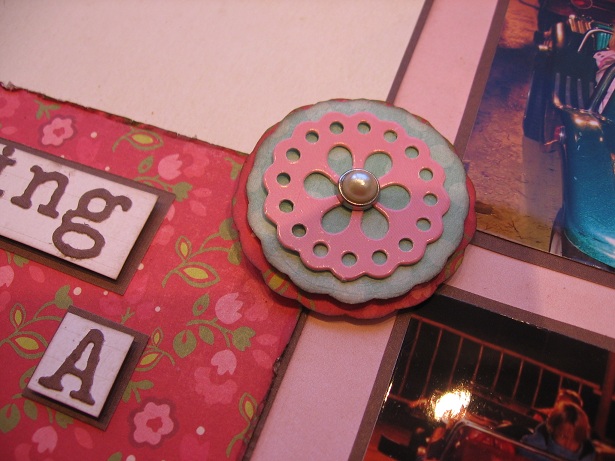 Voor de achtergrond heb ik 2 dezelfde vellen gebruikt. Uit de ene heb ik de grote "scallop cirkel" (om de foto) geknipt en de vlinder eronder, en de linker bovenhoek + die 2 kleine vlindertjes. En dat heb ik later op het onderste vel geplakt om een 3D effect te krijgen.